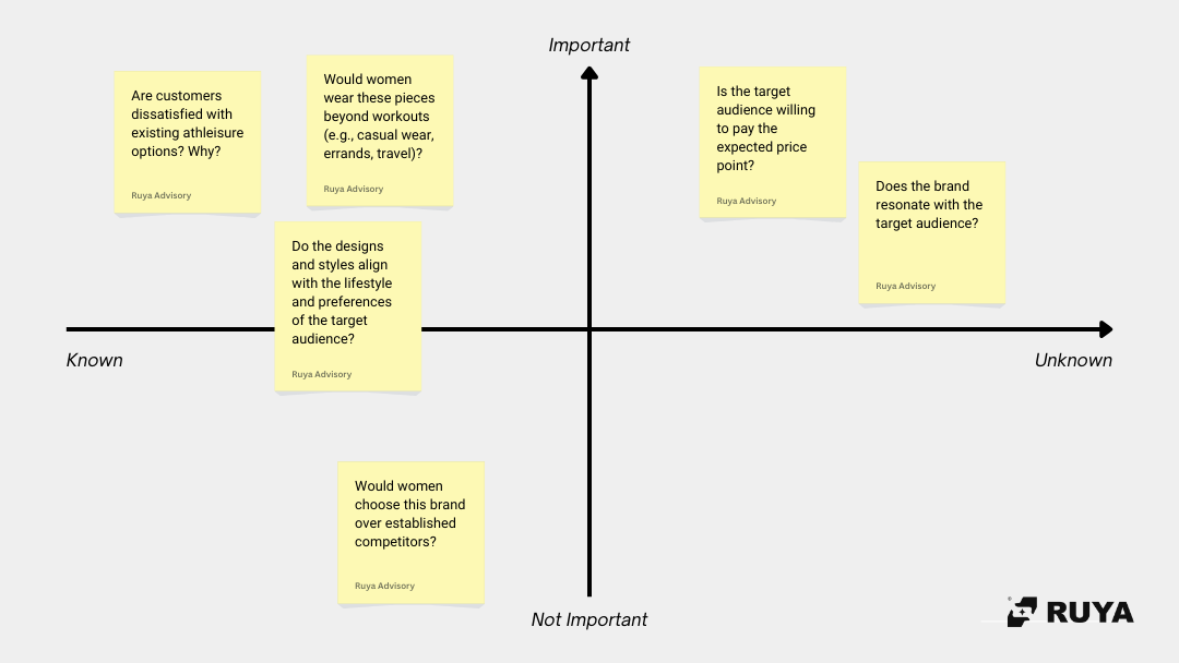 In the example of the athletics founder, our biggest assumptions were: Will the idea have enough appeal? Will people pay a premium for this brand?